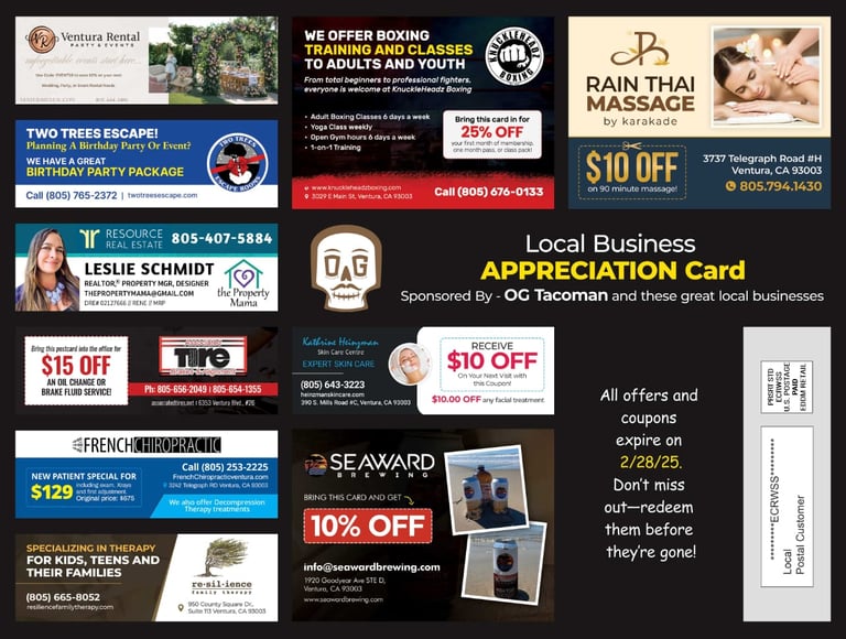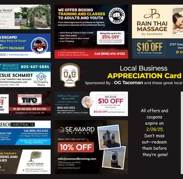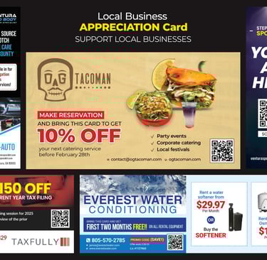 Exciting news! If you are a business in Ventura, you now have the opportunity to be part of a huge "9 x 12" postcard going directly to the residents of Ventura. By teaming with non-competing local businesses, marketing is made possible for a ridiculously low cost. Let's go!